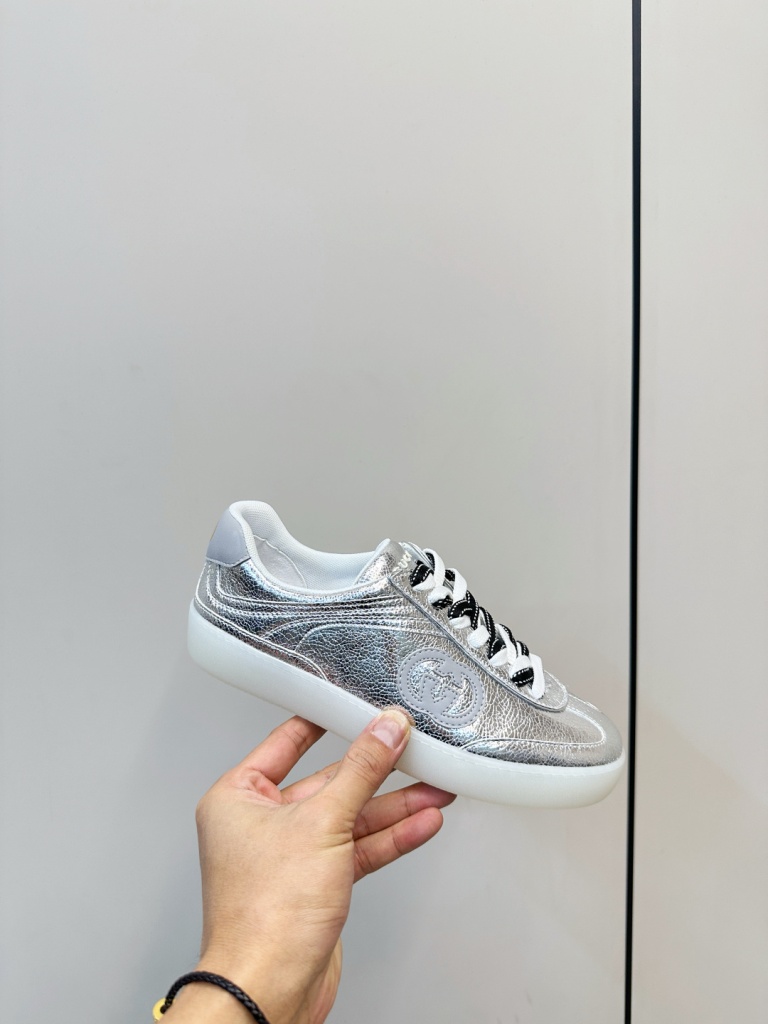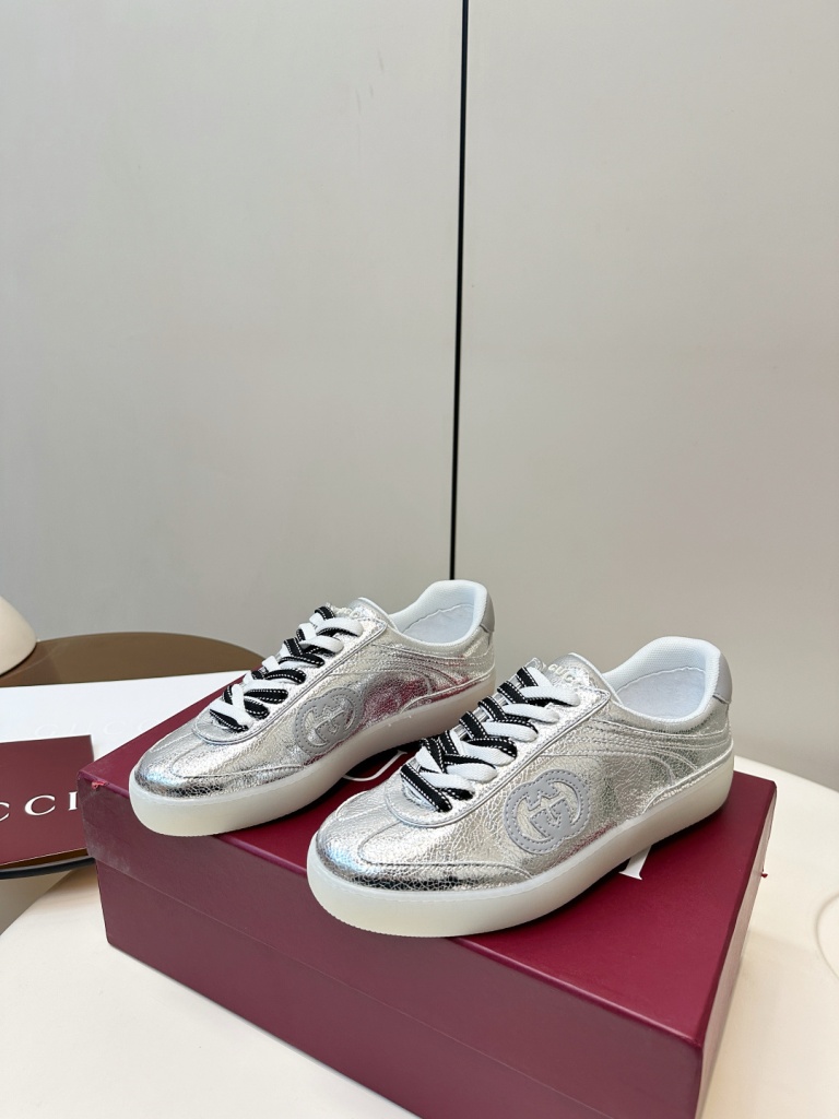 Gucci G75 series sneakers, made of metallic glossy cowhide and two tone shoelaces,