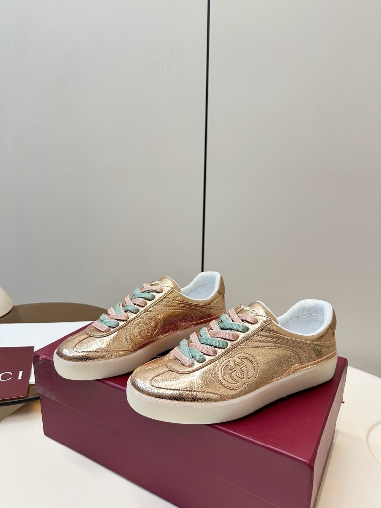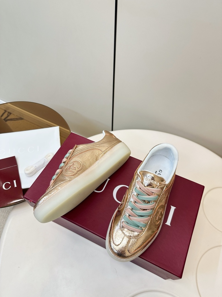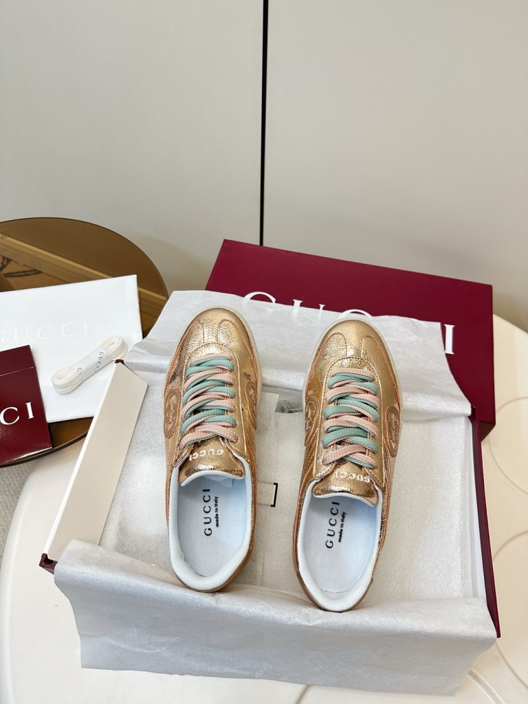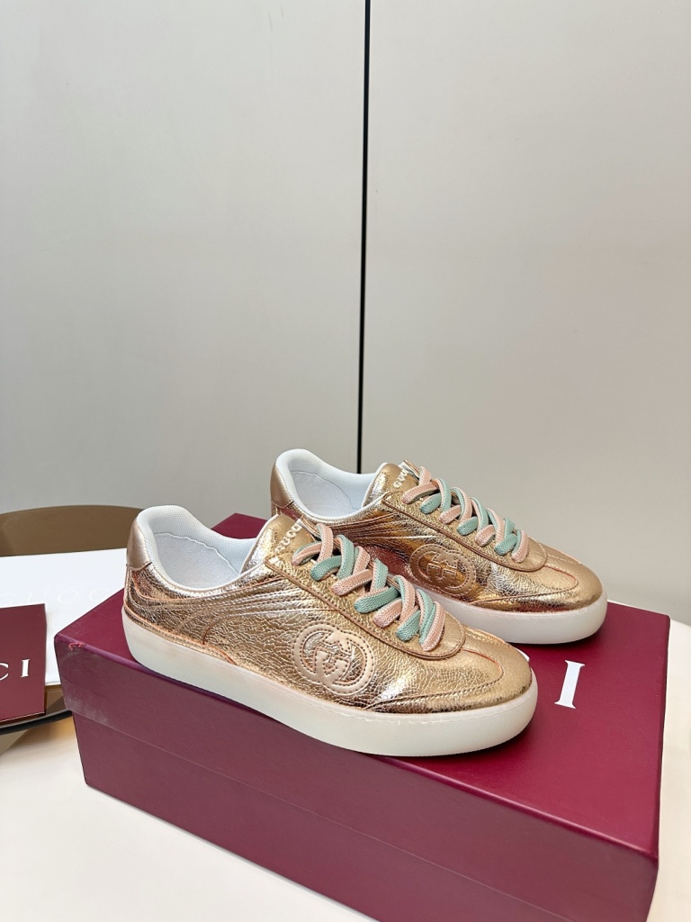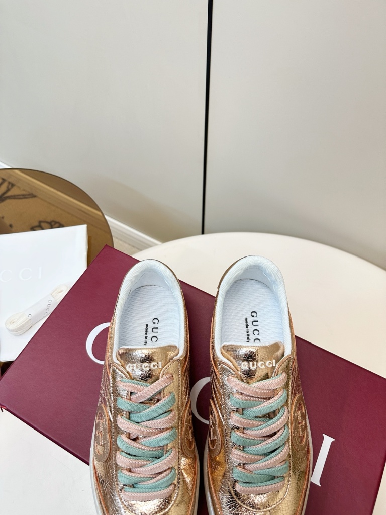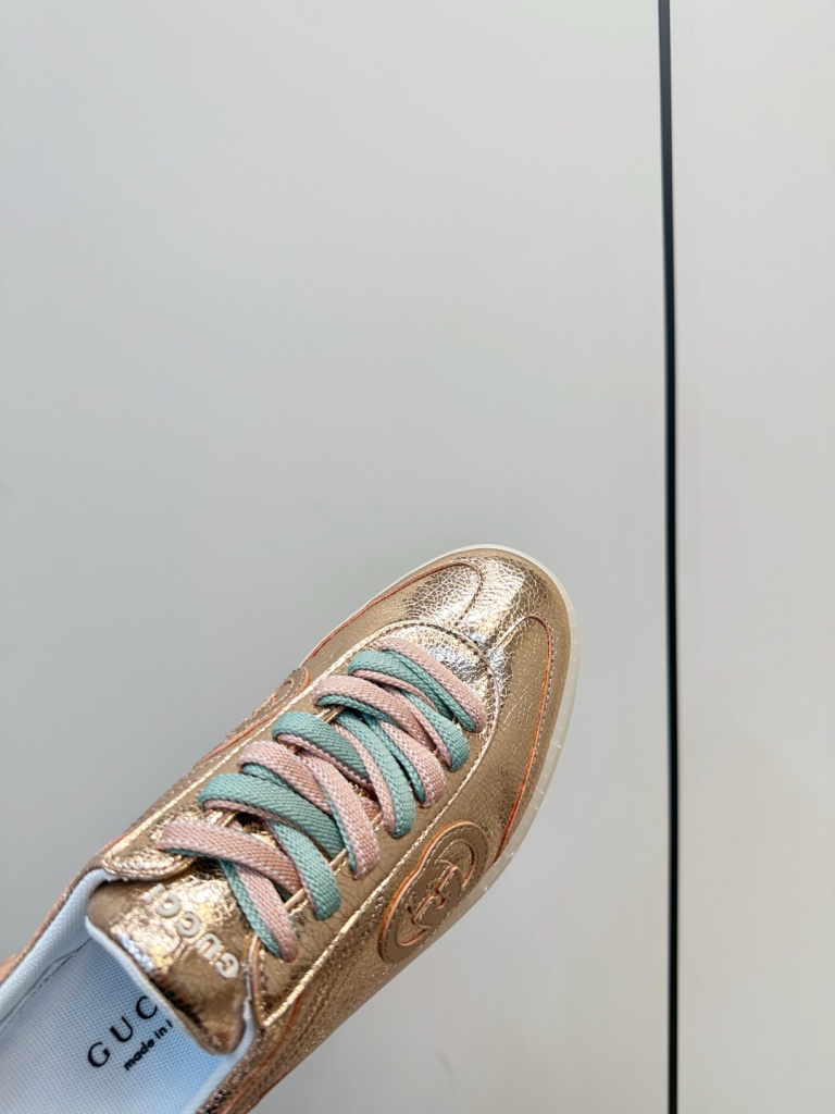 Gucci G75 series sneakers, made of metallic glossy cowhide and two tone shoelaces,